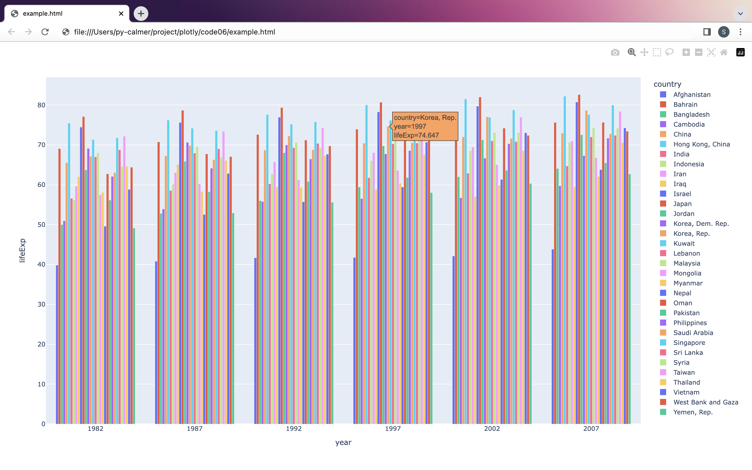 fig = px.bar(df, x="year", y="lifeExp", color="country", barmode="group")